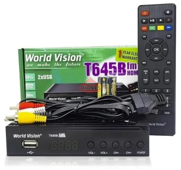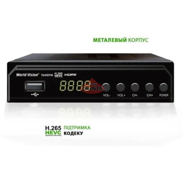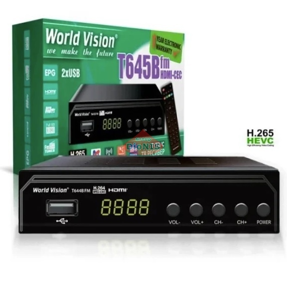 Відмінність World Vision T645B FM від інших Т2 ТВ приставок нового модельного ряду - це наявність світлодіодного LED-дисплея, кнопок керування на лицьовій панелі корпусу і вбудований блок живлення, ця модель займає доступний середній ціновий сегмент пристроїв.