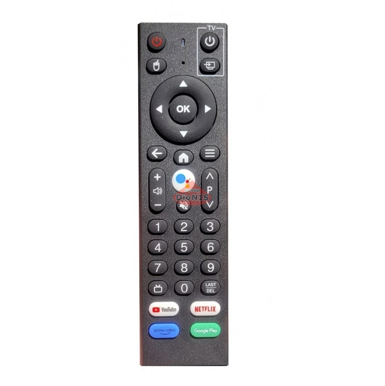Модель цього пульта має всі необхідні основні кнопки для навігації, регулювання гучності та перемикання каналів, а також додаткові спеціальні кнопки швидкого доступу для додатків YouTube, Netflix, Prime Video і Google Play та кнопку з логотипом Google Assistant для активації голосового керування.